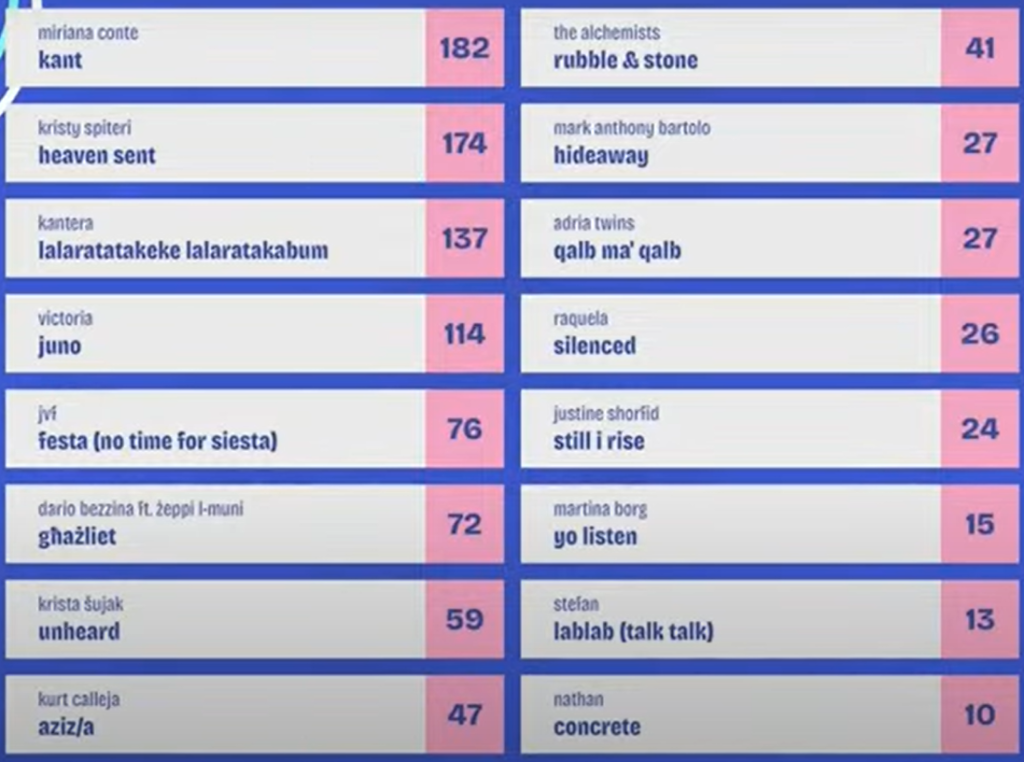 Výsledky dnešní Supersoboty nám zakončuje Malta. Na tomto středozemním souostroví se dnes uskutečnilo finále národního kola MESC, které se stalo již relativně tradiční maltskou soutěží. Během dnešního přenosu jsme měli možnost sledovat 16 soutěžících, kteří si účast zasloužili svým postupem ze semifinále, ta proběhla dříve tento týden. O celkovém vítězi rozhodovali televizní diváci a odborná porota. Podle očekávání se nakonec rozhodovalo mezi dvěma největšími favoritkami soutěže, kterými byly Miriana Conte a Kristy Spiteri. Právě druhá zmíněná dokonce po hlasování poroty vedla o celých 14 bodů před Mirianou, ovšem byli to televizní diváci, jejichž názor rozhodl o vítězi. Miriana Conte televoting ovládla a Kristy skončila až na třetím místě, protože se ještě mezi zpěvačkami umístila skupina Kantera.