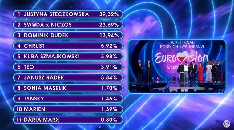 Vítězkou se stala Justyna Steczkowska s písní Gaja, získala bezmála 40 % všech došlých hlasů. Stříbro bralo duo Sw@da x Niczos s písní Lusterka s téměř čtvrtinou hlasů televizních diváků.