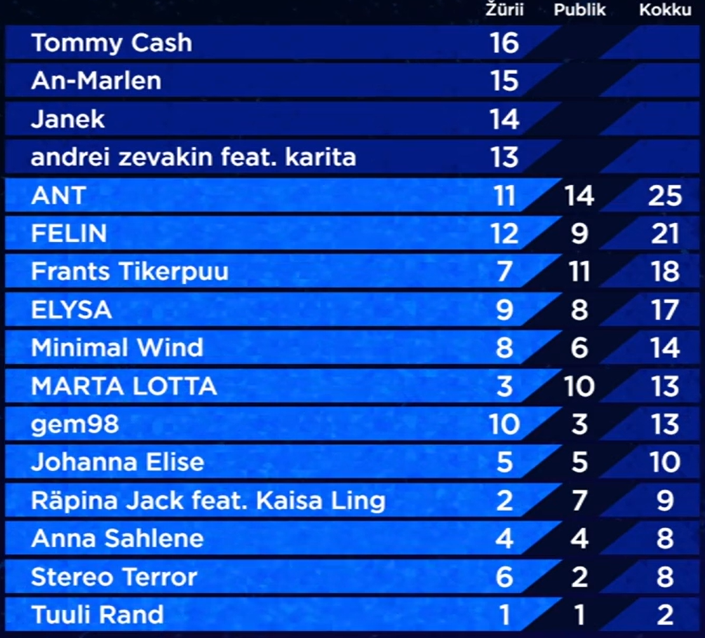 Estonské národní kolo Eesti Laul se jako národní výběr této pobaltské země vrátil i letos, ovšem v pozměněném formátu. Oproti minulým ročníkům, které byly tvořeny několika kvalifikačními koly, jsme letos všech 16 účastníků viděli poprvé naživo až dnes během jednoho soutěžního večera. Samotný systém hlasování ve finále se nezměnil. Po představení všech finalistů proběhlo první kolo hlasování, v němž rovným dílem rozhodovali televizní diváci a mezinárodní porota o třech postoupivších do Superfinále. Těmi se v náhodném pořadí stali An-Marlen, Tommy Cash a Andrei Zevakin ft. Karita. V této druhé fázi už o samotném vítězi a reprezentantovi Estonska na Eurovizi 2025 rozhodovali pouze televizní diváci. Ti měli velice jasný názor, Tommy Cash se s písní Espresso Macchiato stal vítězem s 83% všech hlasů. Andrei Zevakin ft. Karita skončili s 10% druzí a An-Marlen se 7% na třetím místě.