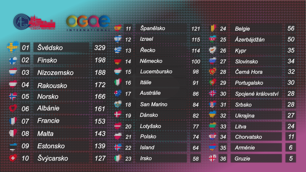 Ani letos nechybí každoroční klasické hlasování fanklubů OGAE. Kdo z 36 letošních ADONXSových konkurentů oslovil fanoušky nejvíce? Nejdříve se podíváme, jak hlasovalo 57 členů našeho českého fanklubu OGAE Česko, což bylo dosud nejvíce hlasujících v historii našeho fanklubu. Celkem jsme rozdali 3306 bodů a takhle vypadá celková TOP 36 v podání českých fanoušků: