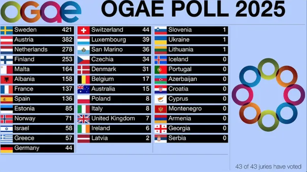 Na špičce výsledkové tabule se dlouhou dobu přetahovali s každým hlasováním Rakousko a Švédsko, tedy i hlavní dva favorité na vítězství v Eurovizi 2025 podle sázkových kanceláří, ale nakonec si Švédsko vybudovalo docela dobrý náskok asi 40 bodů na druhé Rakousko. Třetí Nizozemsko na Rakousko ztratilo přibližně 100 bodů, což je již obrovský odstup a zajímavostí je i to, že se na čtvrtém místě na třetí Nizozemsko silně dotahovala Erika Vikman z Finska. Na opačné straně tabulky pak máme devět zemí, které nezískali v celé anketě ani jeden jediný bod.