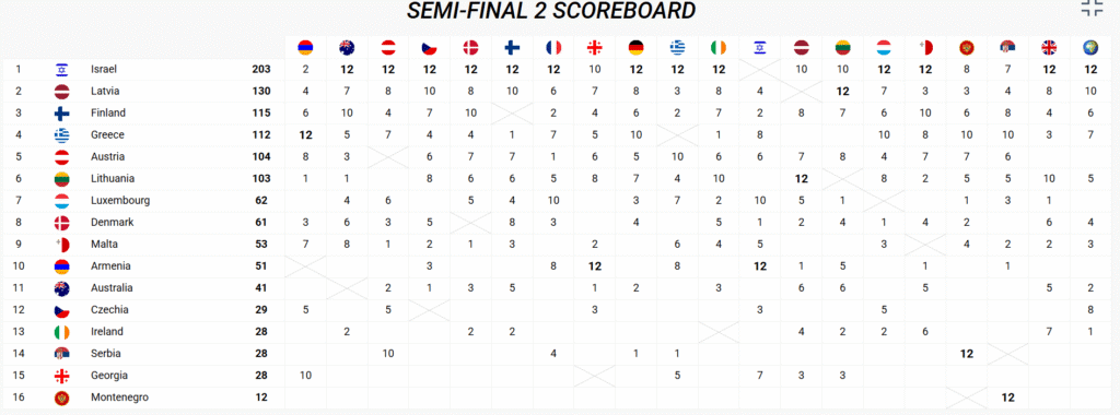 Druhé semifinále, které se uskutečnilo ve čtvrtek 15. května mělo také jasného favorita. Byl jím Izrael, který zvítězil s 203 body, což byl letos v semifinále nejvyšší bodový zisk. Až s odstupem se pak umístila další pětice, která shodně obdržela více než 100 bodů, ale všichni se poskládali do rozmezí 27 bodů od 103 do 130. Tuto šestici postupujících bychom mohli označit za solidní, protože následovala více než 40bodová mezera na další postupové místo. Za zmínku rozhodně stojí, že budoucí vítěz JJ z Rakouska skončil v semifinále až na pátém místě a obecně favorizovaná Erika Vikman z Finska se musela spokojit s třetím místem a na stříbrnou semifinálovou příčku pustila etno-folklórní skupinu Tautumeitas z Lotyšska, což bylo možná jedno z největších překvapení večera. Sázkové kanceláře totiž ještě téměř do začátku přenosu Lotyšsko ani neměly mezi postupující desítkou semifinalistů.