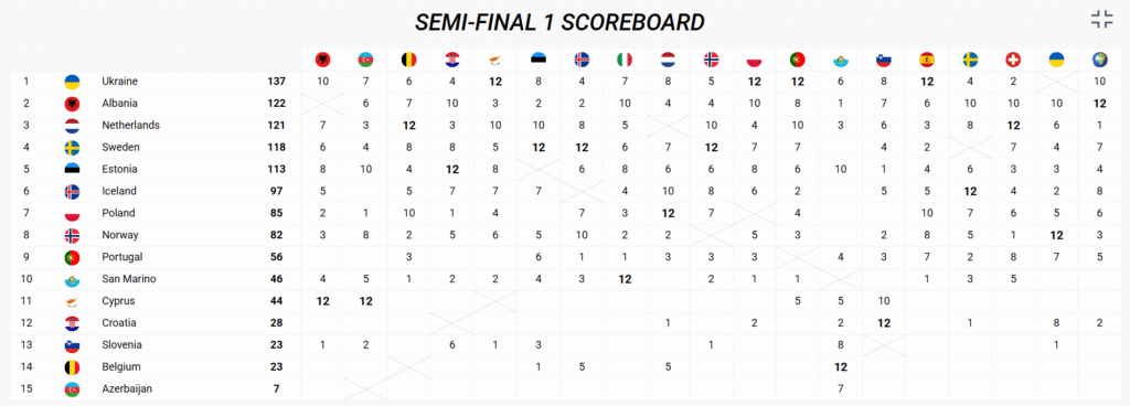 Letos nikdo výrazně zbytku neutekl a TOP 5 prvního semifinále se poskládala do rozmezí 24 bodů. Pomyslná trofej ale putuje na Ukrajinu se solidními 137 body. Větší bodový odstup tak najdeme až po osmém Norsku, kde deváté Portugalsko získalo o 26 bodů méně.