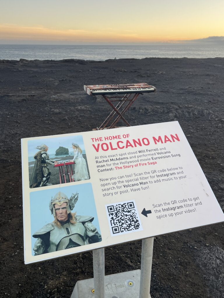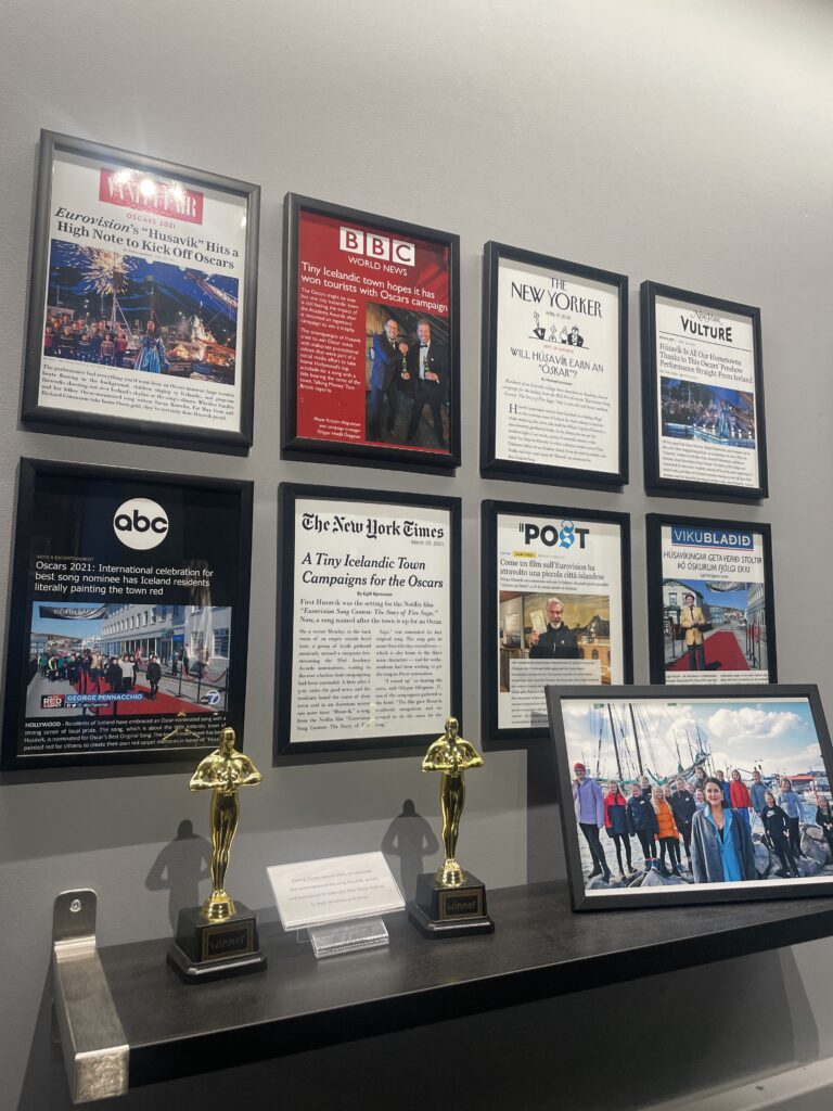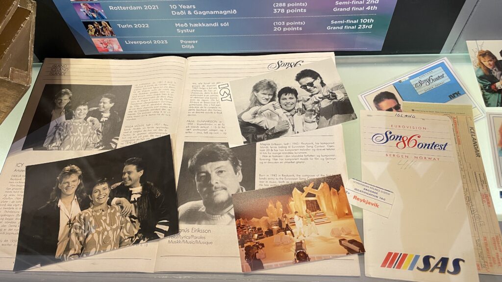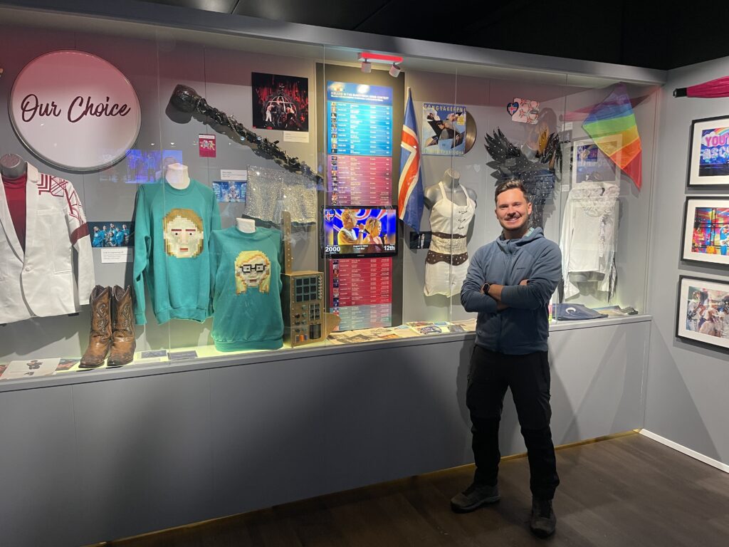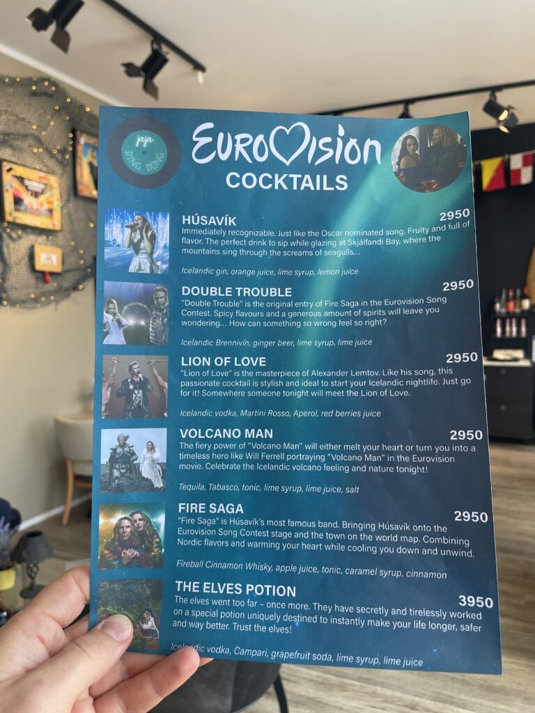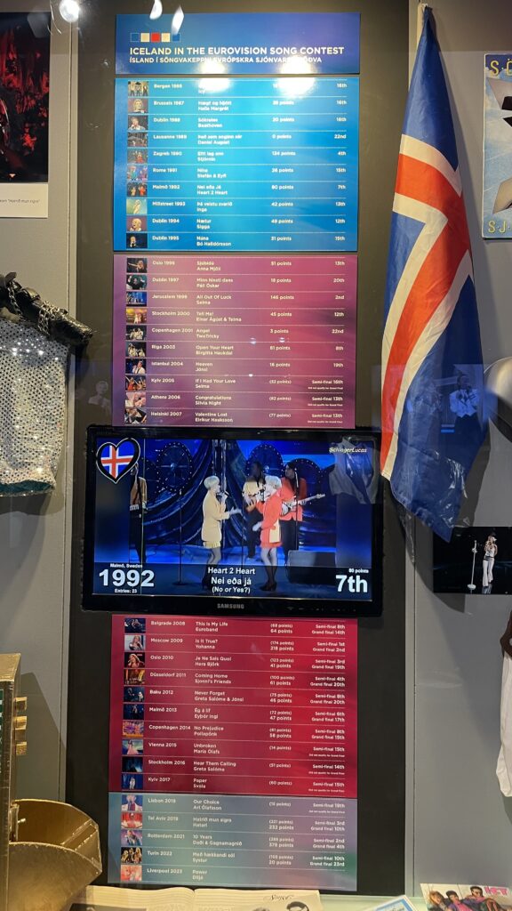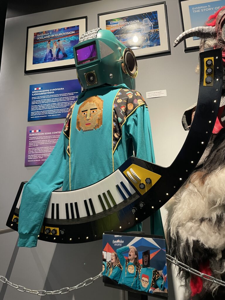 Rybářské městečko Húsavík se dostalo do centra pozornosti díky filmu s Willem Ferrellem a Rachel McAdamsovou „Eurovision Song Contest: The Story of Fire Saga“, kde se velká část filmu odehrává. Od té doby ještě více láká turisty z celého světa včetně eurovizních fanoušků.Dominantou městečka je místní dřevěný luteránský kostel, kde se natáčely jedny z nejznámějších scén z filmu.Přístaviště Húsavíku je lemováno domky s typickou islandskou architekturou, kde se mimo jiné nachází filmová hospoda, kde místní obyvatelé fandili domácí skupině Fire Saga při jejich eurovizních vystoupeních.Po cestě do eurovizního muzea jsme objevili autobusovou zastávku, kde v závěru filmu zastavuje autobus s oběma hlavními představiteli, kteří přijíždí do Húsavíku po svém vystoupení na ESC a jsou vítány davy místních obyvatel.Nad přístavem je již z dálky viditelná budova muzea Eurovize. Štít muzejní budovy zdobí ikonické eurovizní srdce s islandskou vlajkou.Hned vedle vstupu do eurovizního muzea se nachází filmové domečky elfíků, které objevily ve scéně, kde je Sigrit žádá, aby jim pomohli dostat se na Eurovizi.Toto už je vstupní hala muzea s kavárnou. Muzeum bylo otevřeno starostou Húsavíku v červenci 2020 a provozuje ho místní Exploration Museum s povolením Evropské vysílací unie a Netflixu. Vystavuje kostýmy a rekvizity z písňové soutěže ESC, stejně jako kostýmy a rekvizity z filmu.V rohu kavárny je situováno piano se zarámovanými eurovizními fotografiemi, které přibližují nejen film, který Húsavík proslavil, ale i jedinečné vystoupení švédské zpěvačky Molly Sandén, která během vyhlašování Oscarů 2021 živě s dětským sborem zazpívala svůj hit Húsavík (My Hometown) přímo z přístavu.Muzeum se skládá ze tří hlavních výstavních prostor. První je věnován Islandu a jeho cestě ESC. Druhá výstava vypráví příběh soutěže Eurovision Song Contest po více než sedm desetiletí. Třetí výstavní prostor představuje rekvizity a kostýmy z filmu ESC: Fire Saga od Netflixu.První část výstavních prostot vypráví příběh Islandu v soutěži Eurovision Song Contest a představuje kostýmy a rekvizity několika účastníků této země v průběhu let.Přehled dosavadních islandských účastníků ESC a dosažených výsledků od první účasti Islandu až po Liverpool 2023, kdy uprostřed panelu běžela krátká videa eurovizních vystoupení Islandu včetně prvního islandského příspěvku Gleðibankinn z roku 1986.Detailní pohled na fotografie islandských reprezentantů ESC, ale i třeba letenku s aerolinkou SAS na ESC 1986.Jeden z nejvýraznějších islandských počinů poslední eurovizní dekády, 2020 a 2021, Daði og Gagnamagnið.Trofej pro vítěze islandského národního kola Stefán Hilmarssona a Eyjólfur Kristjánsson z roku 1991 – písňové soutěže Söngvakeppnin. Její vítěz zpravidla reprezentuje Island v ESC, pokud se tedy nekonal interní výběr, jak tomu bylo v letech 1995 až 1999, a v roce 2004, 2005 a 2021.Druhá část výstavních prostor je věnována více než sedmdesátileté historii Eurovision Song Contest.Klíčové eurovizní momenty nejznámějších vítězů ESC přibližuje návštěvníkům tento panel.K nahlédnutí byly i tištěné oficiální programy různých ročníků ESC, my nahlédli do programu ESC 2016 ve Stockholmu, kde ve finále na 25. místě skončila naše Gabriela Gunčíková.V improvizovaném studiu si mohl každý účastník vyzkoušet roli vyhlašovatele výsledků národní poroty.My jsme samozřejmě nemohli jinak, než našich 12 bodů udělit Islandu!Eurofans zóna nabídla možnost zahrát si na klavír a podívat se na několik LP z historických eurovizních ročníků.Nechyběly ani tematické eurovizní kostýmy, z nichž některé bylo možné si i vyzkoušet.Improvizované eurovizní pódium nabízí možnost vyzkoušet si moderaci či karaoke eurovizních songů. V době naší návštěvy „okupovaly“ pódium turistky z USA.Třetí výstavní prostor představuje rekvizity a kostýmy z filmu Eurovision Song Contest: Fire Saga.Návštěvníci mají jedinečnou možnost nahlédnout pod pokličku natáčení tohoto filmu, který se z velké části odehrává právě zde, v Húsavíku, kde se zrodila „světoznámá“ FIRE SAGA.Nechybí zde ani klávesy z filmu, na které hrál jeden z hlavních představitelů filmu Lars Ericksson (Will Ferrell), na kterém je umístěný deníček, do kterého si filmová Sigrit Ericksdottirová (v podání Rachel McAdams) zaznamenává text své nové písně na hotelovém pokoji, která pak má premiéru během živého eurovizního finále.Kostýmy pro oba hlavní představitele, pěvecké duo z Husaviku, Larse Erickssona a Sigrit Ericksdottirovou, pro píseň Volcano Man.Na samotném konci výstavních prostor je prezentován příběh kampaně města Húsavík za získání Oscara za rok 2021 za píseň, která se objevila ve filmu a byla pojmenována po městě Húsavík. Nakonec zůstalo pouze u nominace. Tato nádherná balada v podání Molly Sandén, si alespoň podle nás určitě Oscara zasloužila! Ale i nominace na Oscara, ale i na Grammy (za nejlepší filmovou hudbu) je úspěchem.Příjemné posezení po návštěvě muzea ve stylové kavárně jaja Ding Dong s možností dát si eurovizní drink. My jsem nakonec, díky nutnosti usednout za volant, volili eurovizní kafe, neboť naší další „eurovizní“ zastávkou byly krásné přírodní scenérie Islandu, kde se točily filmové záběry pro píseň Volcano Man.Ale nabídka míchaných alkoholických nápojů byla opravdu signifikantní.Cestou z muzea jsme šli po silnici, po které běžel filmový Larse Ericksson.Plní zážitků z Húsavíku jsme se vydali na jih Islandu, do míst, kde se točily záběry pro úvodní fi